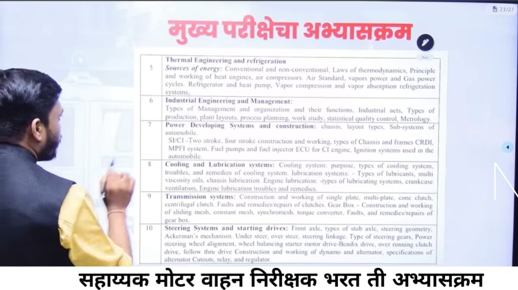 RTO bharti selection process पहीली पूर्व परिक्षा त्या नंतर मुख्य परीक्षा होते. पूर्व परिक्षा कशी होते ते पहा. पूर्व परिक्षेसाठी 100 गुणांची परीक्षा असते, पश्न 100 असतात आणि एक तासांचा वेळ असतो ही परीक्षा मराठी किंवा इंग्रजी माध्यमातून देता येते. या भरती मधील प्रश्नांचे स्वरूप हे पदवी लेवल चे प्रश्न यामध्ये विचारले जातात. या परीक्षेनंतर मुख्य परीक्षा घेतली जाते. यामध्ये mcq पद्धतीने प्रश्न असतात. मुख्य परीक्षेसाठी यंत्र अभियांत्रिकी स्वयंचलन अभियांत्रिकी आधारित प्रश्न विचारले जातात प्रश्नांचा स्तर पदवी लेवलचा असतो पदवी लेवल चे प्रश्न या मुद्दे विचारले जातात. मुख्य परीक्षा देण्यासाठी इंग्रजी माध्यमामधून द्यावी लागते मुख्य परीक्षेमध्ये 100 प्रश्न विचारले जातात यासाठी 300 गुण असतात यासाठी दीड तास वेळ देण्यात येतो. यासाठी टेक्निकल आणि नॉन टेक्निकल चे सुद्धा प्रश्न उमेदवारांनी करावे ते सुद्धा परीक्षेत विचारले जाऊ शकतात या परीक्षेमध्ये बहुपर्यायी प्रश्न विचारले जातात.